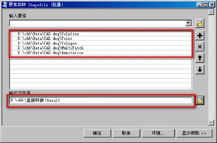(4)在目录列表“默认工作目录----Ch6”下“直接转换\Data”目录“CAD.dwg”文件上右键单击选择【导出】----【转为Shapefile(批量)】,打开【要素类转Shapefile(批量)】对话框。在对话框中设置如下:输入要素:CAD.dwg组下的所有类型。输出文件夹“ch6\直接转换\Result\”。如图6.4所示。此方法可以把CAD数据整体转换为Shapefile文件。