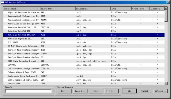 (3)在【Interoperbility Connections】对话框中,点击【Format】后的按钮,打开【FME Reader Gallery】对话框。里面列出了FME支持的数据格式。在其中选择“Autodesk AutoCAD DWG/DXF”选项。如图所示。