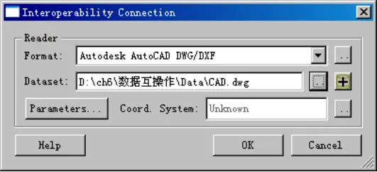 (4)在【Interoperbility Connections】对话框中,设置Dataset:“\ch6\数据互操作\Data\CAD.dwg”。