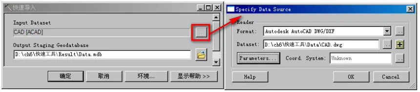 按钮,打开【Specify Data Source】对话框,Format:“Autodesk AutoCAD DWG/DXF”,Dataset:“\ch6\快速工具\Data\CAD.dwg”,设置完成后关闭;Output Staging Geodatabase:“\ch6\快速工具\Result\Data.mdb”。如图所示。