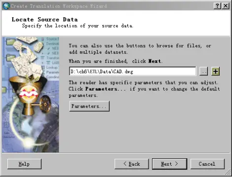 (5)在【Locate Source Data】 中选择“\ch6\ETL\Data\CAD.dwg”作为数据源,如图所示。单击下一步。