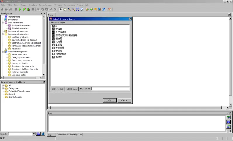 (10)设置完成后会打开【ArcGIS Spatial ETL Tool】程序窗口,如图所示。在程序中出现【Select Feature Types】对话框选择需要转换的图层名称。取消“管线层”前的对勾,单击“OK”。