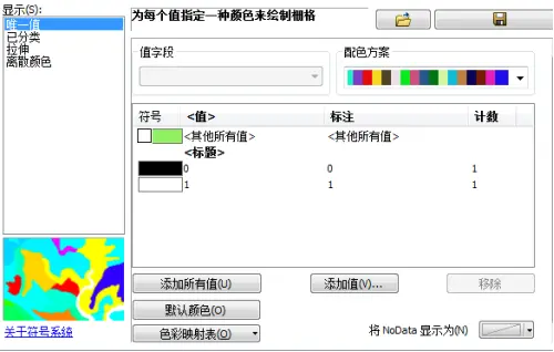 (2)在【内容列表】中“地形图(二值化).tif”图层上右键单击选择【属性】----【符号系统】,显示选项里面选择【唯一值】,如图所示。