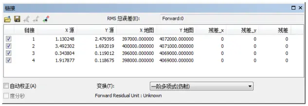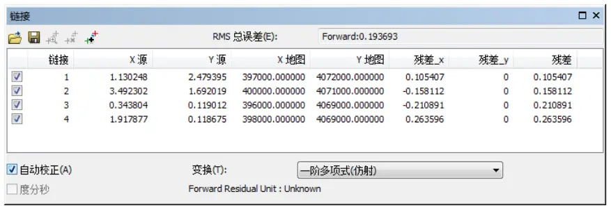 (6)【链接】对话框中,变化方法选择“一阶多项式(仿射)”,并勾选“自动校正”。完成设置后如图所示。