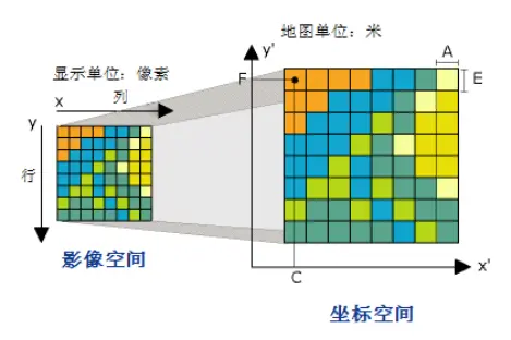 一阶多项式变换常用于对影像进行地理配准。使用仿射(一阶)多项式变换对栅格数据集进行变换。如图所示。可看到六个参数定义将栅格的行和列变换至地图坐标。