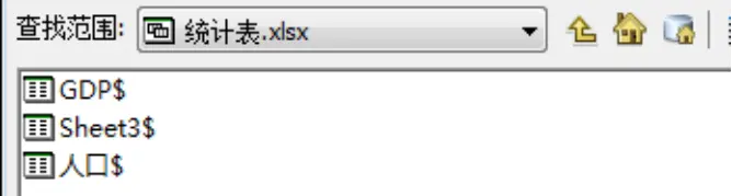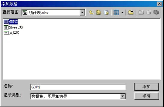 (2)在ArcMap主工具条上单击【添加数据】按钮,打开【添加数据对话框】,定位到“\ch6\表关系\Data”目录下,加载“统计表.xlsx”,选择其下的“GDP$”工作表。如图所示。