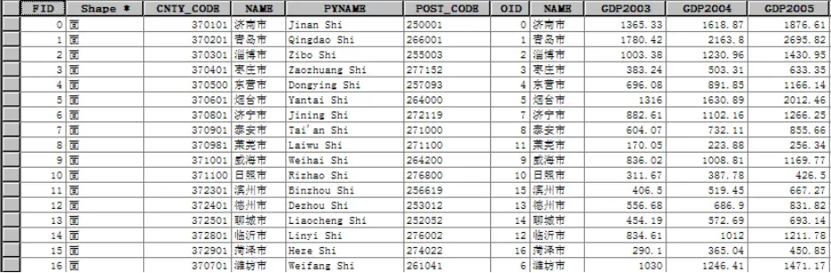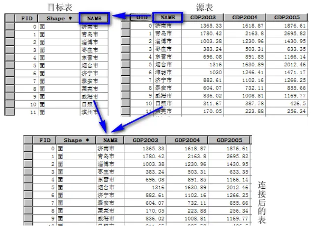 例如,山东省县行政区划图中,图层属性表中包含县和市的名称;各个地市历年GDP统计表中含有市的名称,构成了多对一的关系。如图所示。