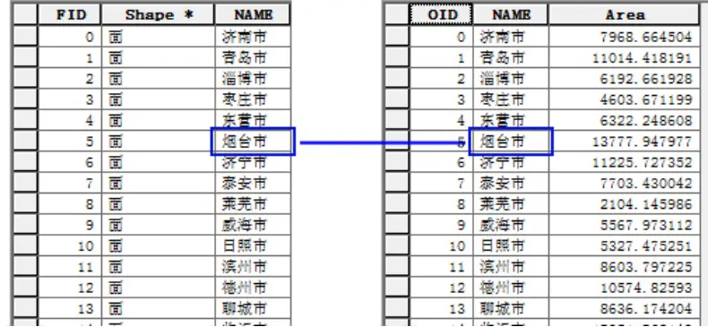 例如山东省市行政区划图中,图层属性表存储的是山东省17个地市的名称;独立的面积统计表中按照地区名称记录了其面积。即一个地区对应着一个面积。如图所示。