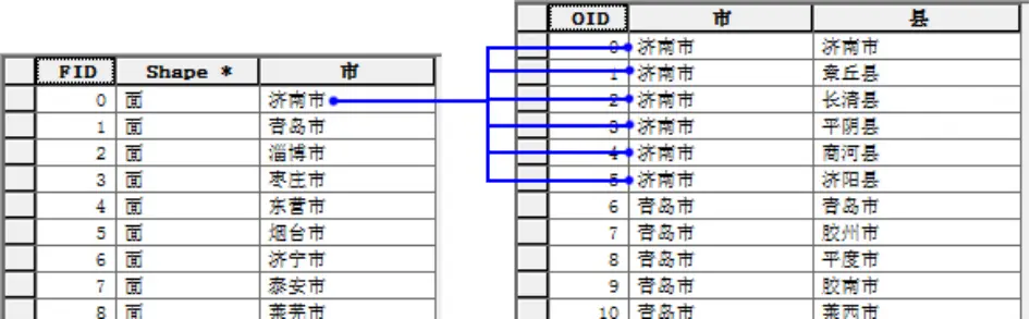 例如山东省市行政区划图中,图层属性表记录了17个市的名称;而县统计表中包含了县的名称和所属市的名称,构成了一对多的关系。如图所示。