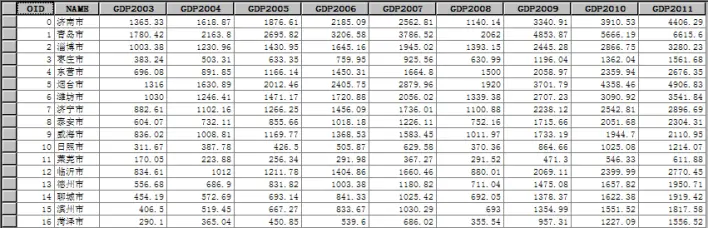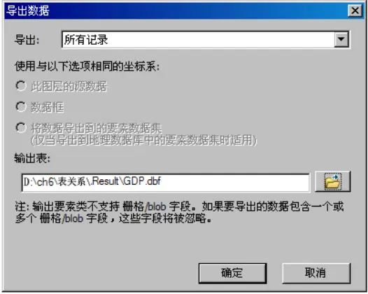 (4)在“GDP$”工作表上右键单击选择【数据】----【导出】,打开【导出数据对话框】,输出表:“ch6\表关系\Result\GDP.dbf”,如图所示。表导出结果如图所示。