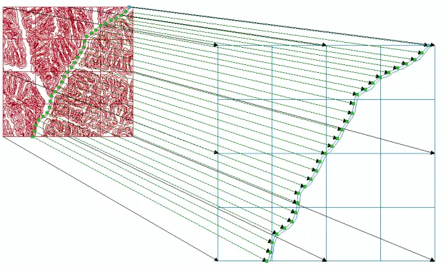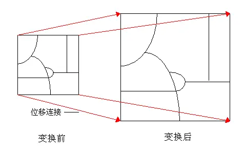 在橡皮页变换期间,表面实际是被拉伸了,采用保持直线的分段坐标变换来移动要素。与坐标转换相似,偏移链接在橡皮页变换中用于确定要素要移向何处。