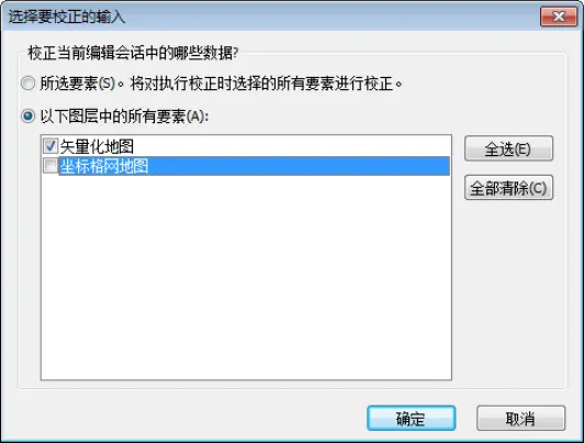 【空间校正】工具条上,单击【空间校正】----【设置校正数据】,打开【选择要校正的输入】对话框。对话框中勾选:“以下图层中的所有要素”,勾选“矢量化地形图”,如图所示。