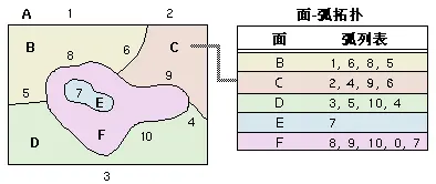 每条弧段都出现在两个面中,下图中,列表中的弧段 6 出现在 B 和 C 中。由于面仅是定义其边界的弧段的列表,弧段坐标只被存储一次,因而可减少数据量并确保相邻面的边界不发生重叠。