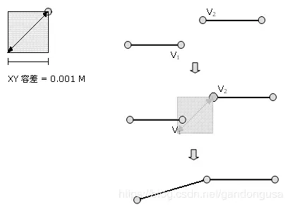 x,y 容差是一个极小的距离值(默认值为 0.001 米,以地面上单位为单位)。它用于在聚类操作过程中解决坐标交叉点位置不精确的问题。使用几何操作处理要素类时,如果两个坐标的 x 距离和 y 距离位于彼此的 x,y 容差范围内,这两个坐标会被视为重合(也就是说,共享同一个 x,y 位置)。因此,聚类坐标会被移动到某个公共位置。