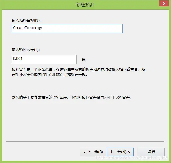 (2)输入拓扑名称:“CreateTopology”,拓扑容差默认,单击【下一步】。