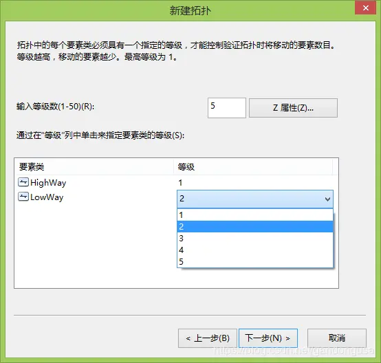 (4)在拓扑等级设置如下:HighWay等级为1,LowWay等级为2,单击【下一步】。