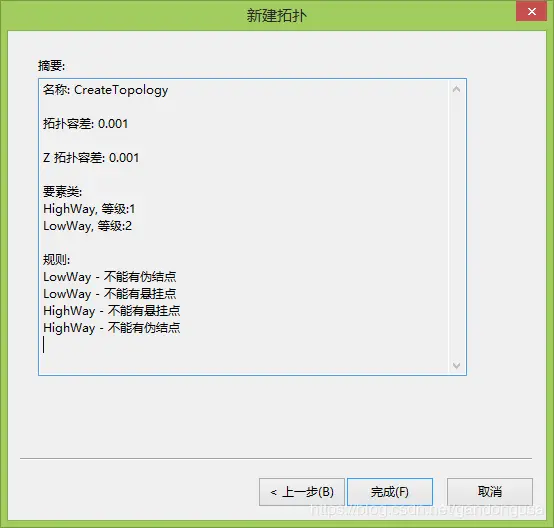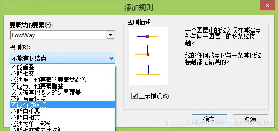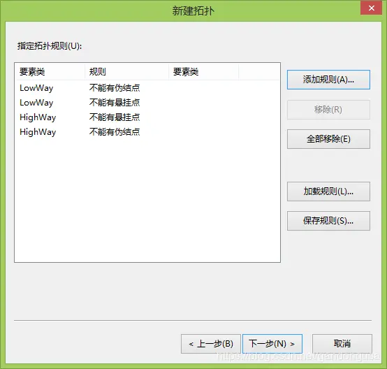 (5)添加拓扑规则。点击右侧【添加规则】,打开【添加规则】对话框,在要素类 的要素中选择:“LowWay”,在规则中选择:“不能有伪结点” ,按照上述方法再次添加以下规则:LowWay,“不能有悬挂点”;HighWay,“不能有伪结点”和“不能有悬挂点”,单击【完成】结束。