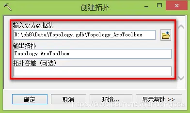 (2)在输入要素数据集中输入:“\ch8\Data\Topology.gdb\Topology_ArcToolbox”,输出拓扑:“Topology_ArcToolbox”,拓扑容差默认,单击【确定】完成拓扑创建。