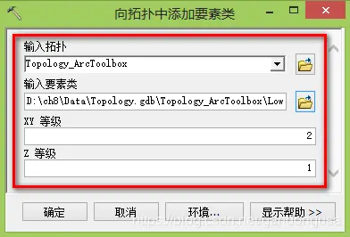 (4)添加要素类。单击工具箱中【拓扑】下的【向拓扑中添加要素类】,打开【向拓扑中添加要素类】对话框,设置如下: