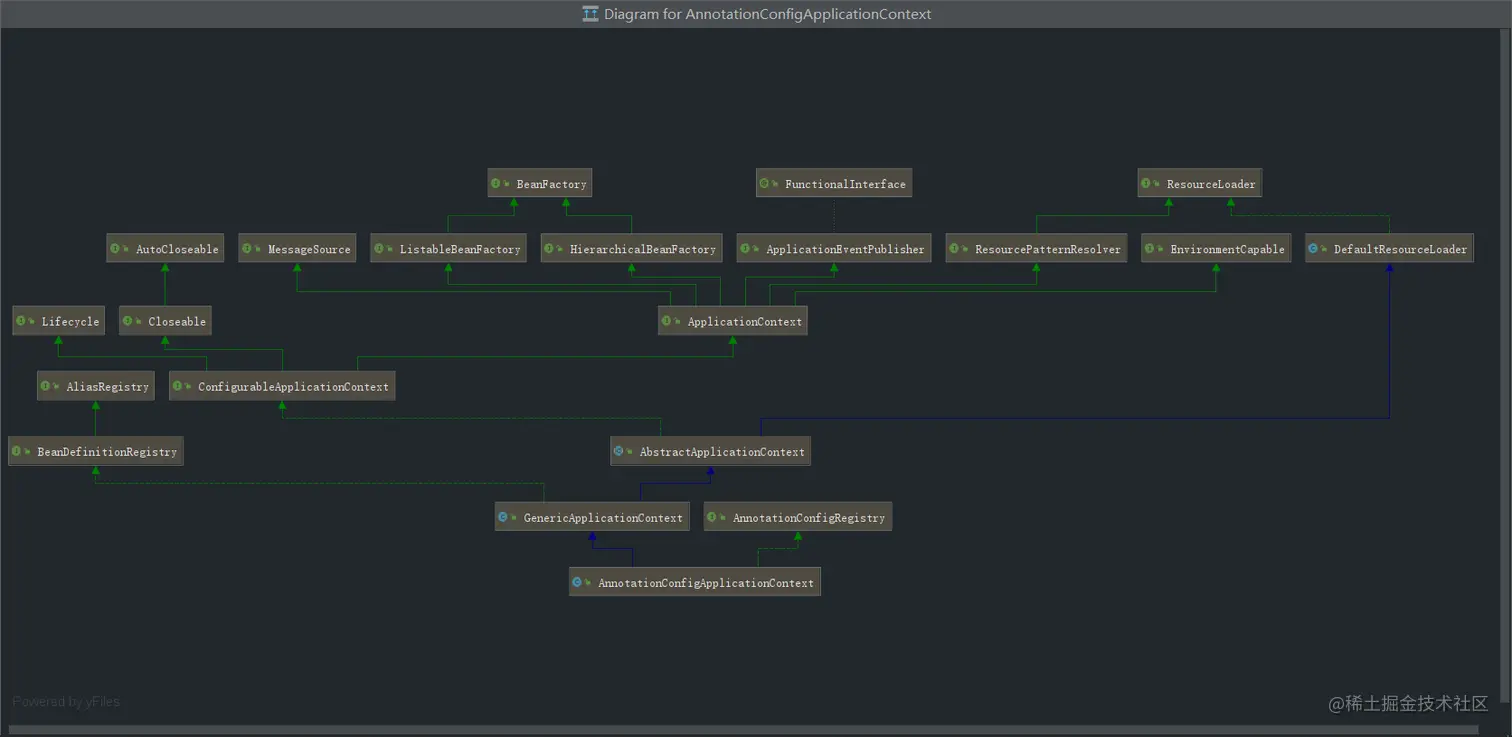 这里其实就是将自己构造方法产生的对象返回给AnnotationConfigApplicationContext。追踪到这一层的时候,容器对象的身世之谜才终于被我们揭开。其实ApplicationContext之所以有Beanfactory能力就是因为有关容器的操作他都委托给自己内部的容器对象了。举个例子: