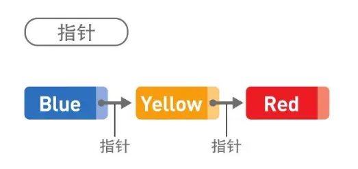 如上图所示就是链表的概念图,Blue、Yellow、Red 这 3 个字符串作为数据被存储于链表中,也就是数据域,每个数据都有 1 个指针,即指针域,它指向下一个数据的内存地址,其中 Red 是最后 1 个数据,Red 的指针不指向任何位置,也就是为 NULL,指向 NULL 的指针通常被称为空指针。