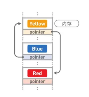这时,只需要把 Green 指针指向的位置从 Yellow 变成 Red,删除就完成了。虽然 Yellow 本身还存储在内存中,但是不管从哪里都无法访问这个数据,所以也就没有特意去删除它的必要了。今后需要用到 Yellow 所在的存储空间时,只要用新数据覆盖掉就可以了。