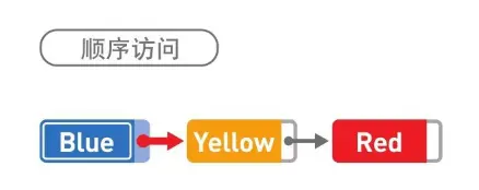 因为数据都是分散存储的,所以如果想要访问数据,只能从第 1 个数据开始,顺着指针的指向一一往下访问(这便是顺序访问)。比如,想要找到 Red 这一数据,就得从 Blue 开始访问,这之后,还要经过 Yellow,我们才能找到 Red。