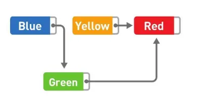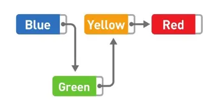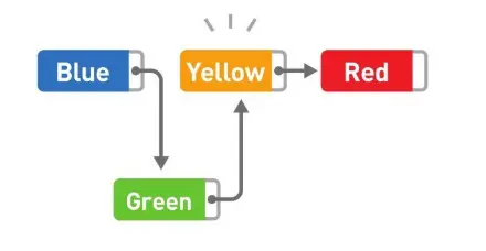 如果想要添加数据,只需要改变添加位置前后的指针指向就可以,非常简单。比如,在 Blue 和 Yellow 之间添加 Green。