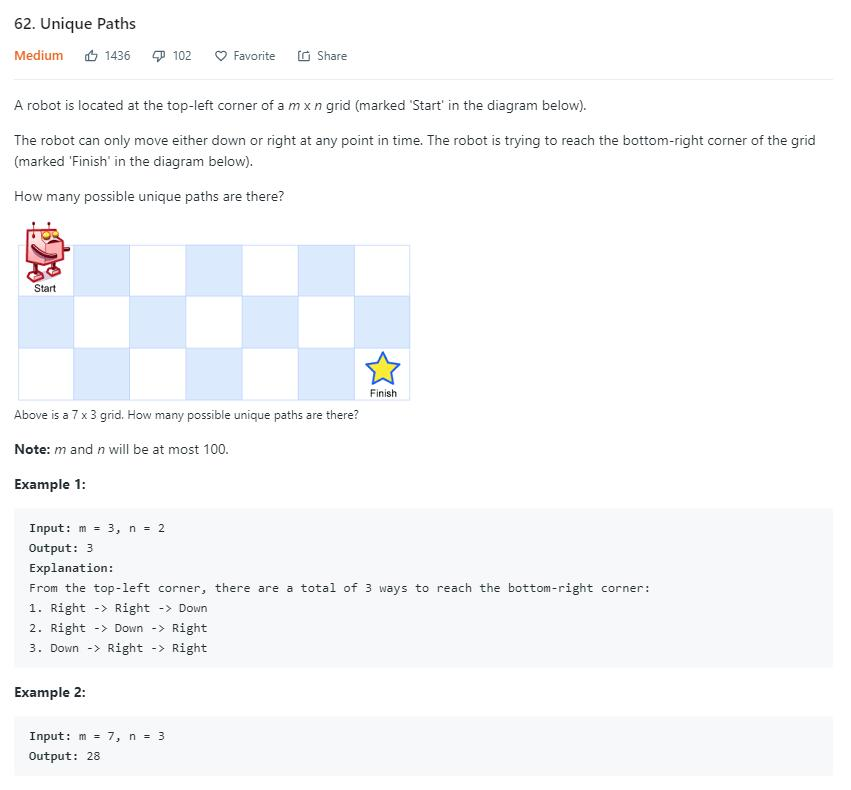 从左上角,到右下角,总会是 3 个 R,2 个 D,只是出现的顺序不一样。所以求解法,本质上是求了组合数,N = m + n - 2,也就是总共走的步数。 k = m - 1,也就是向下的步数,D 的个数。所以总共的解就是 。