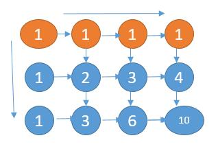 机器人从左上角走到右下角,只能向右或者向下走。输出总共有多少种走法。