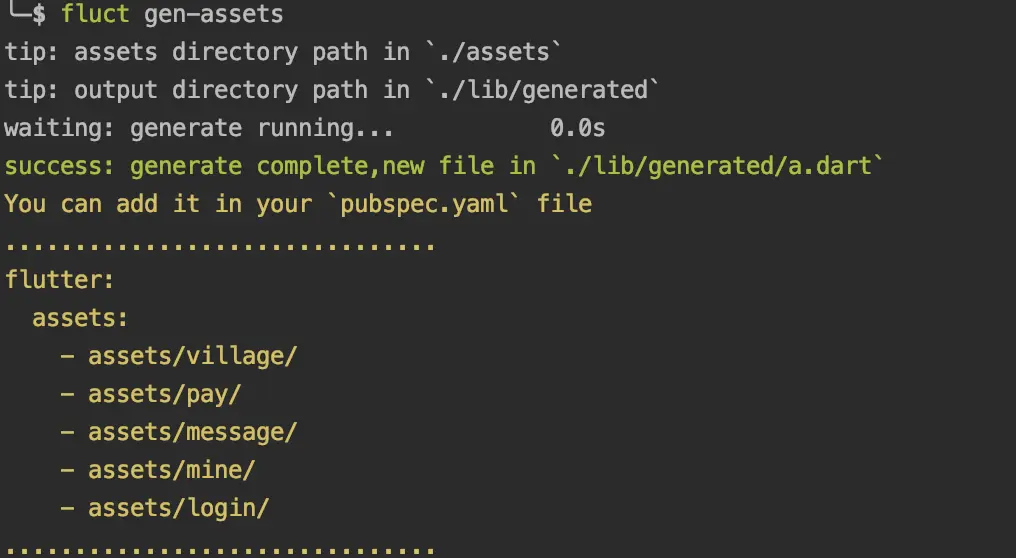 这一步如果文件多起来,很容易出现混乱,导致声明麻烦,引用麻烦,并随着项目的迭代,资源文件有些不用了,也不知道哪个是哪个,这个时候,fluct gen-assets命令帮到你