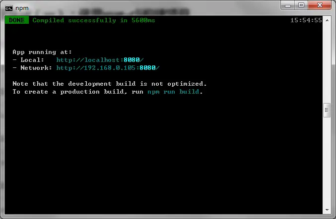 敲击回车后,项目开始构建,如果没有报错,那么项目已经成功创建了。当前目录下会生成一个项目名文件夹,进入到该文件夹,然后执行npm run serve命令,出现以下内容,说明项目已经成功打包并部署到了本地8080端口。