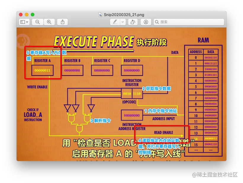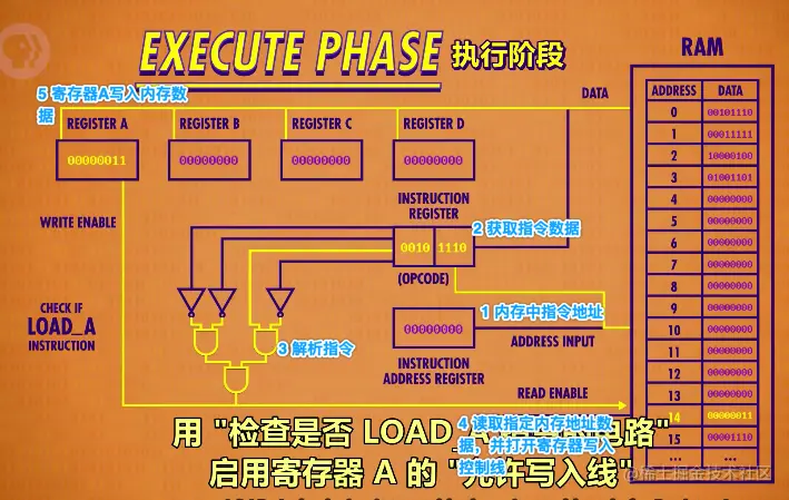 用 0010 举个例子,0010 是 LOAD_A,功能是把内存中指定位置的数据读取到寄存器A中: