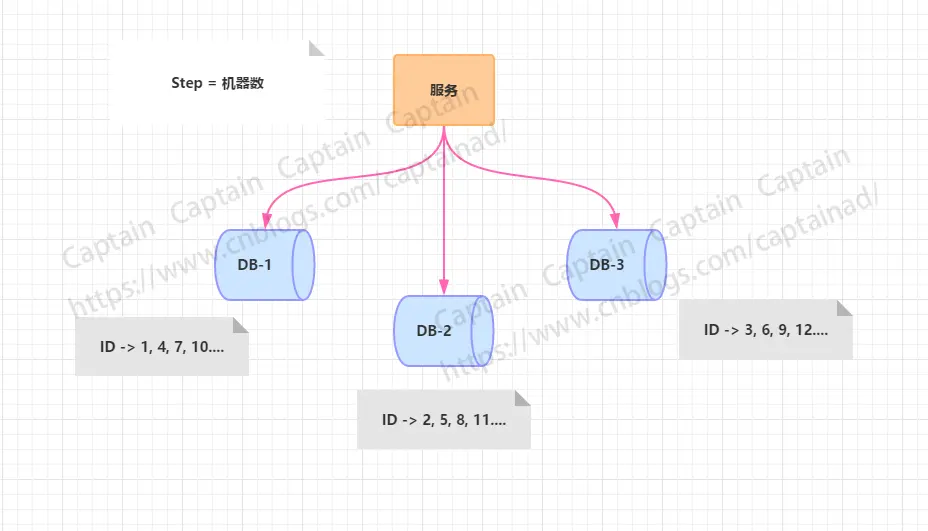 上面我们大致讲解了数据库主键自增的方式,讨论的时单机部署的情况,如果要以此提高ID生成的效率,可以横向扩展机器,平衡单点数据库的压力,这种方案如何实现呢?那就是在auto_increment的基础之上,设置step增长步长,让DB之前生成的ID趋势递增且不重复。