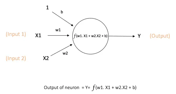 上面的网络从输入X1和X2获取数值,并从节点关联的w1和w2中获取权重。另外还要一个输入1**,关联的权重为b(Bias:偏置)。我们将在后面详细解释偏置。