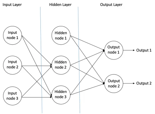 输入层: 输入层含有三个节点,Bias节点有一个值 1,其他两个节点将 X1 和 X2 作为外部输入(取决于输入数据集的数值)。前面已经讲过,在输入层不进行任何的计算,因此输入层的输出分别是 1,X1 和 X2,其被馈送到隐藏层。