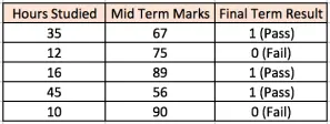 前两个输入栏显示的是学生学习的小时数和学生中期考核。最终的结果列有两个值 0 或者 1 ,表示学生是否通过了期末考核。例如,可以看到,如果学生学习了35个小时,并在中期获得了67分,他/她就最终通过了期末考核。