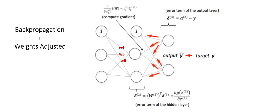 在上一步中,可以看到计算的输出有很大的误差,我们通过计算输出节点处的总误差,并通过网络使用反向传播将这些误差传播回计算梯度。然后使用一种优化的方法,例如梯度下降来调整所有网络节点中的权重,目的是减小输出层的误差。如下图所示(先忽略下图中的数学方程):