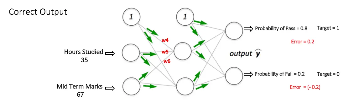 假设输出层两个节点的输出概率分别为 0.4 和 0.6(由于权重是随机分配的,因此输出也是随机的)。我们可以看到计算的概率(0.4 和 0.6)里最终的期望概率(1 和 0)非常远,因此下图被定义为“不正确的输出”。