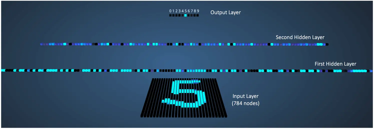 具有比其他输出值更高的输出值的节点由更亮的颜色表示。 在输入层中,亮节点是接收较高数值像素值作为输入的节点。 注意在输出层中,唯一的明亮节点对应于数字5(其输出概率为1,其高于输出概率为0的其他九个节点)。 这表示MLP已正确分类输入数字。