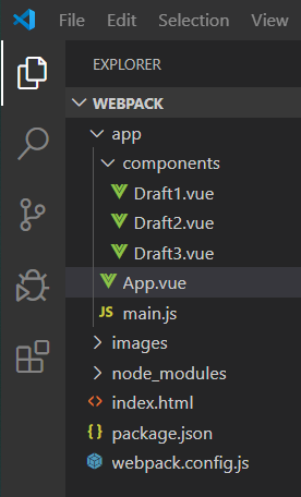 在app文件夹下新建components文件夹后就可以在里面创建自定义组件,如图Draft1, Draft2, Draft3都是自定义组件,是App.vue的子组件。