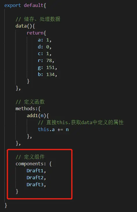 创建好的自定义组件必须要在components中进行定义(或称注册),React中则不存在这样的机制。