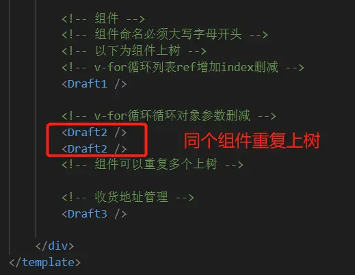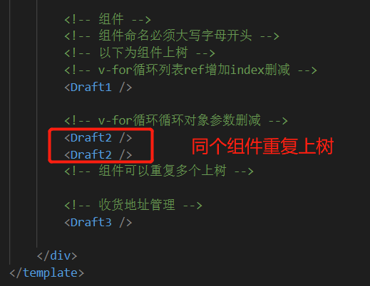 引入的自定义组件还需要上树。自定义组件以单标签的形式上树,也可以写成双标签但没有意义,写在这样的双标签中的内容不会有任何作用。