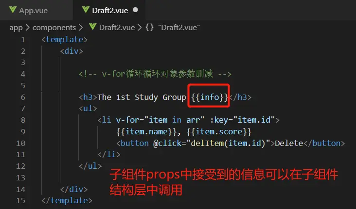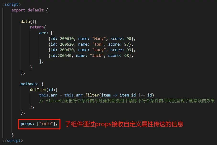 任何自定义组件都可以在其于父组件上树时添加自定义的HTML属性来给该子组件传达信息,这就是props。子组件通过export default{ }中的props属性来接收这些信息,props属性的属性值是一个数组。