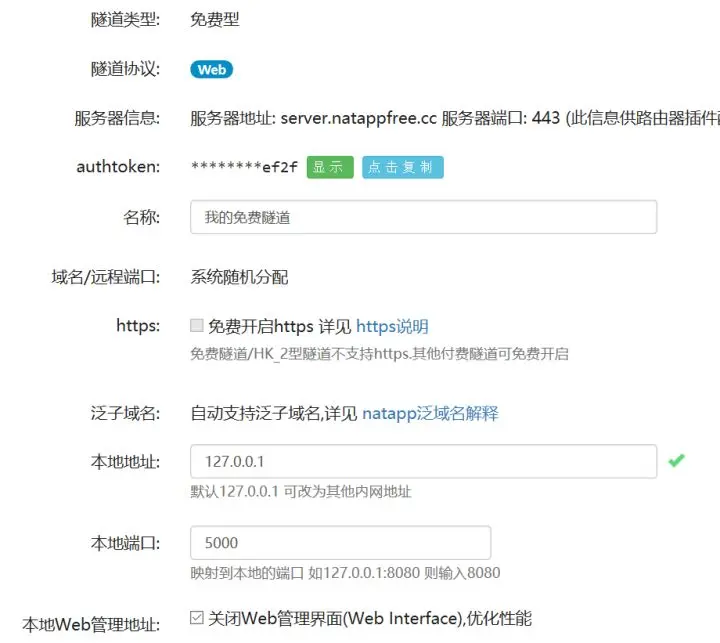 配置完成后,得到自己的一个免费隧道,如下图所示,复制隧道的authtoken,启动NatApp时要用到: