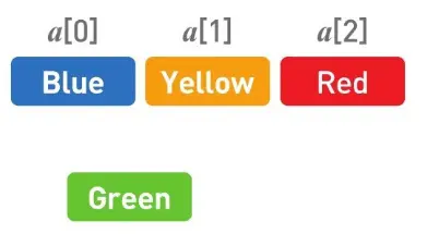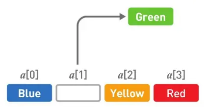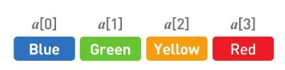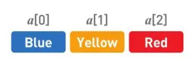 如上就是数组的概念图,Blue、Yellow、Red 作为数据存储在数组中,其中 a 是数组的名字,后面 [] 中的数字表示该数据是数组中的第几个数据,该数字也就是**数组下标,下标从 0 开始计数**,比如 Red 就是数组 a 的第 2 个数据。
