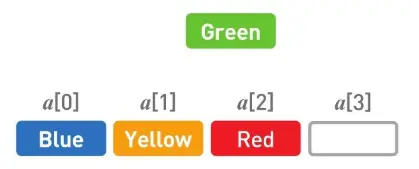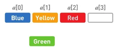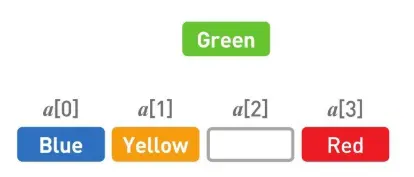 但是,如果想在任意位置上添加或者删除数据,数组的操作就要比链表复杂多了。这里我们尝试将 Green 添加到第 2 个位置上。