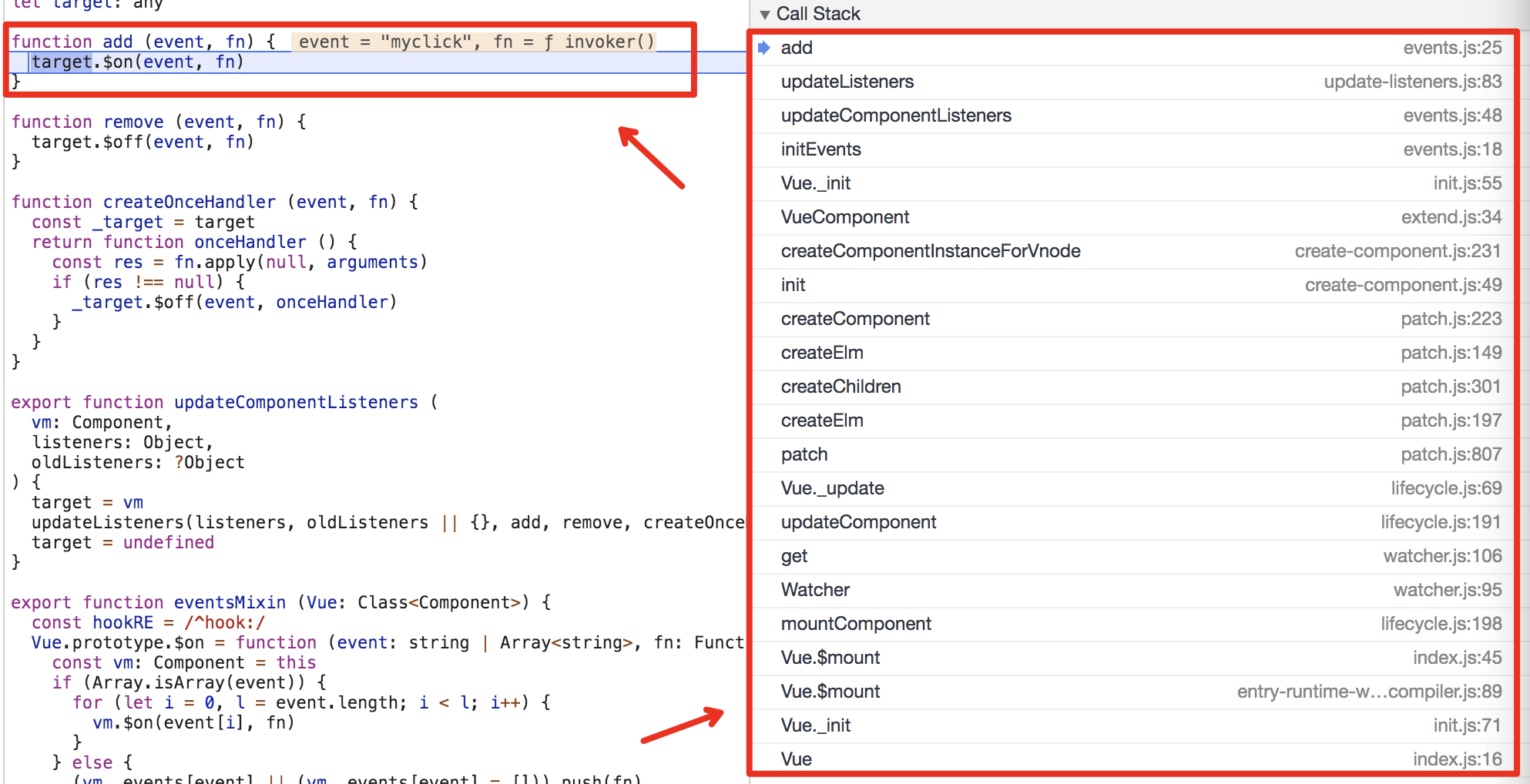 这里直接放一个源码调试过程中调用栈的图,从图中可以看到从new Vue()到最终调用add函数进行组件事件的监听的整个流程。