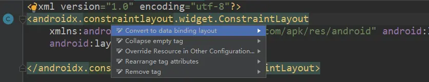 在布局文件中,选中根布局的View,按住 Alt + 回车键,点击“Convert to data binding layout”,转换成DataBinding布局。