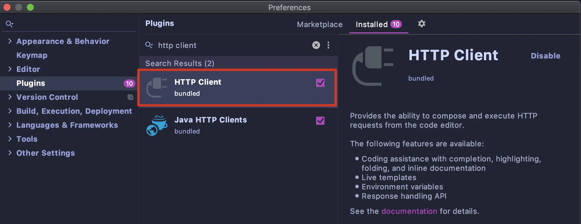 HTTP Client 是 IDEA 默认绑定好并启用的插件,如果你那里没有启用,按照下图启用就好